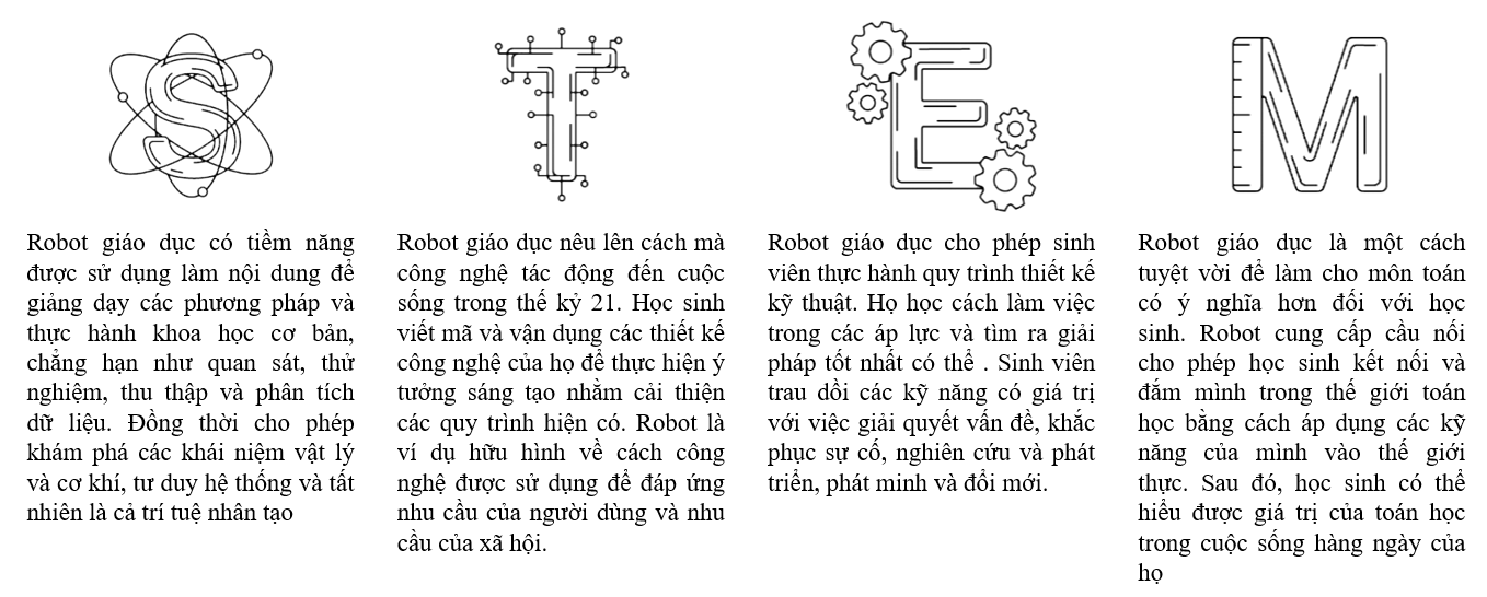 Nghiên cứu về robot giáo dục mang lại nhiều cơ hội học tập vì có ứng dụng STEM (Khoa học, Công nghệ, Kỹ thuật và Toán học) vào giải quyết những vấn đề thực tế của cuộc sống hàng ngày xung quanh chúng ta. Robotics luôn mang tính liên ngành theo những cách hữu hình và có thể áp dụng cho học sinh. Học sinh có được sự hiểu biết và kiến thức thông qua việc kết nối các khái niệm từ mỗi lĩnh vực STEM. Các hoạt động liên quan đến robot đòi hỏi sinh viên phải cộng tác, suy nghĩ tính toán, khắc phục sự cố và đổi mới - tất cả các kỹ năng cơ bản cho người học thế kỷ 21 và cả các chuyên gia thế kỷ 21.